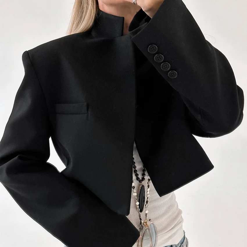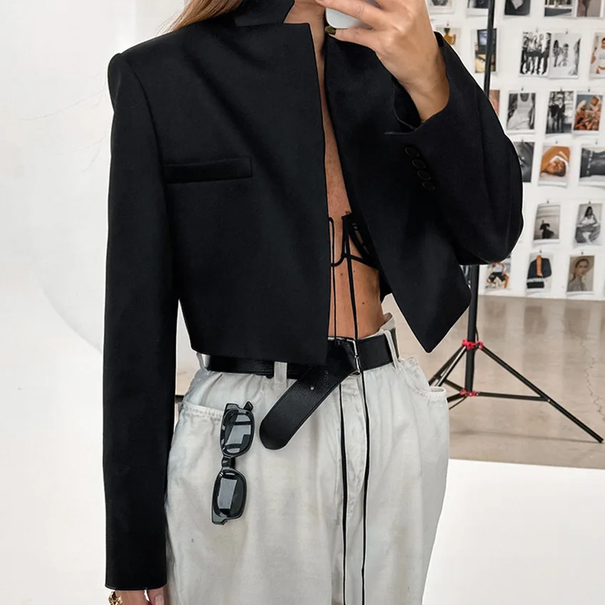High Quality 2024 Elegant Women Black Lapel Short Jacket Vintage Long Sleeve Blazer Female Outerwear Chic Tops Short Suit Jacket